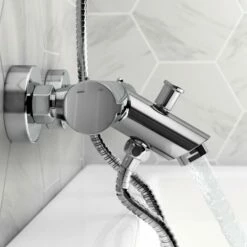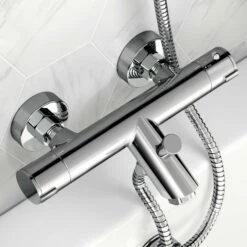 - Complete bath filler shower system includes thermostatic bath tap and slider hand shower