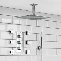 Be the first to review “Ceiling Chrome Square Thermostatic Set – 300mm Head, Hand Shower & Jets” Cancel reply