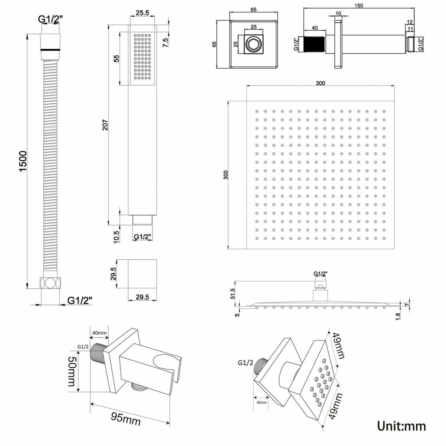 - High quality polished chrome finish ceiling shower arm, slim 300mm shower head, hand shower and body jets