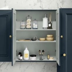 Be the first to review “Inky Blue Wall Hung Mirror Cabinet 700x600mm – Gold Accents” Cancel reply