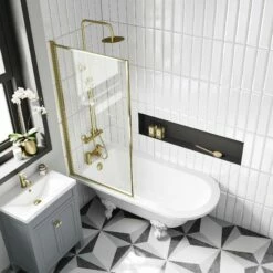 Abingdon 1500 Roll Top Shower Bath – White Ball Feet & 6mm Easy Clean Brushed Brass Framed Screen